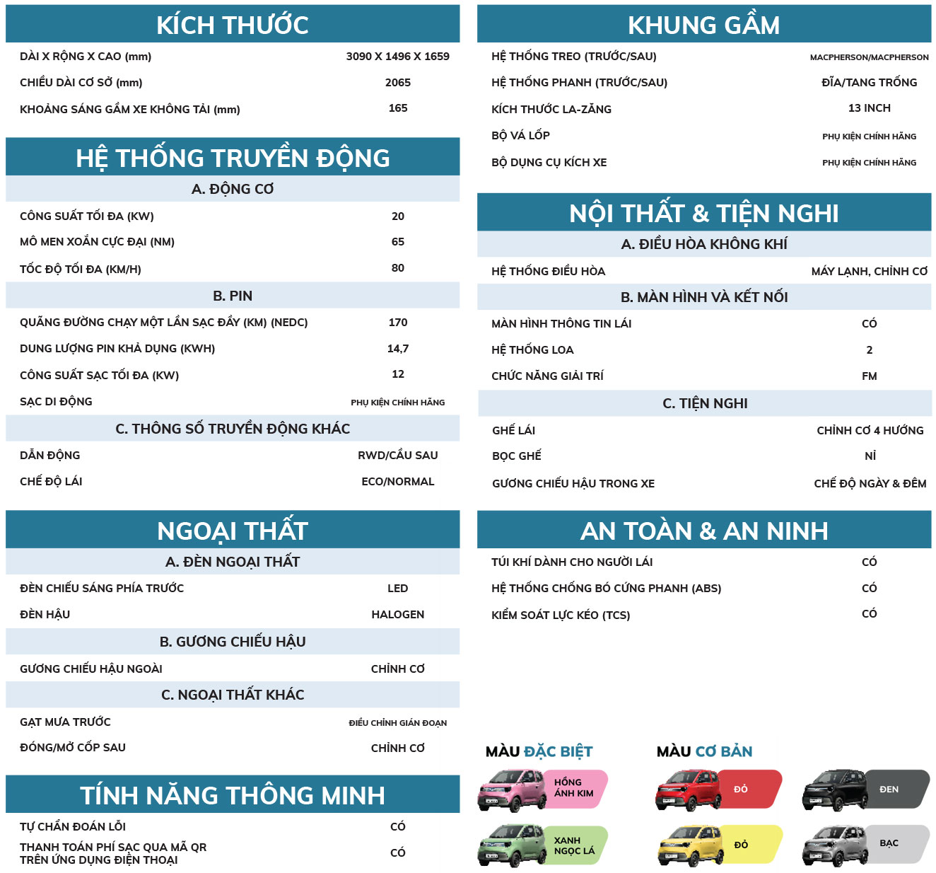 VinFast Minio Green trang bị động cơ điện có công suất tối đa 20 kW, pin có khả năng hoạt động tới 170 km sau mỗi lần sạc đầy, hỗ trợ cả sạc nhanh DC (công suất tối đa 12 kW) và sạc chậm AC (công suất tối đa 3,3 kW). Với hiệu quả kinh tế cao và khả năng vận hành linh hoạt, Minio Green là lựa chọn lý tưởng thay thế xe máy khi di chuyển nội đô, góp phần thay đổi diện mạo giao thông đô thị và nâng cao chất lượng cuộc sống.